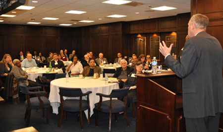speaking with crowd
